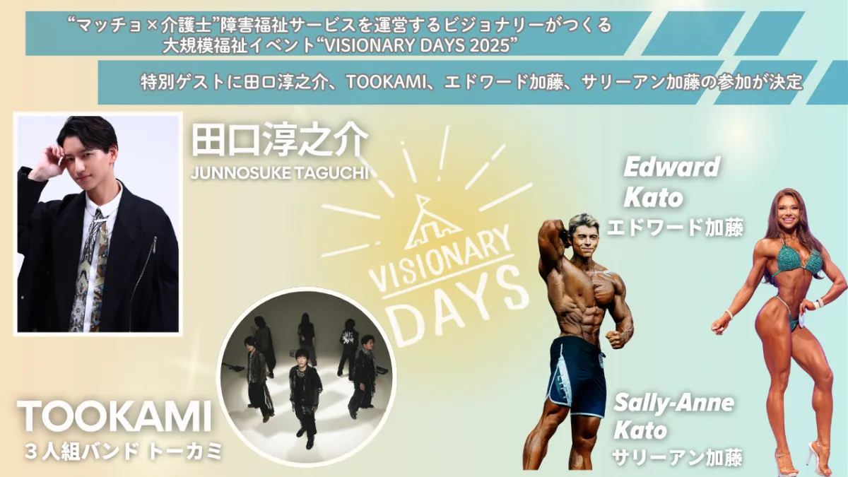 イベントの目玉は、福祉への関心を深め、ビジョナリーの理念に賛同する様々な特別ゲストの参加です。そのなかでも特に注目されるのは、音楽やタレント活動を行う田口淳之介さんの出演です。彼はライブステージでのパフォーマンスや、ビジョナリーが運営する障害福祉サービス利用者とのコラボダンスを披露する予定で、これにより参加者は楽しいひと時を過ごせるでしょう。