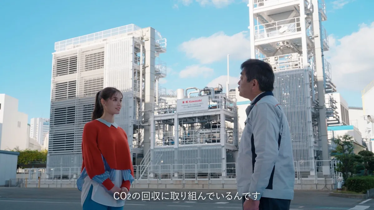 また、今回のCM作りには、CO₂回収設備の開発に携わった担当者が参加しており、技術の背景について語るシーンもあります。「宇宙ステーションなどの閉鎖環境で使用するために開発された技術が、現在は地球のカーボンニュートラルに寄与している」と説明する中で、川崎重工の技術の進化にトラウデンさんも大いに感心していました。