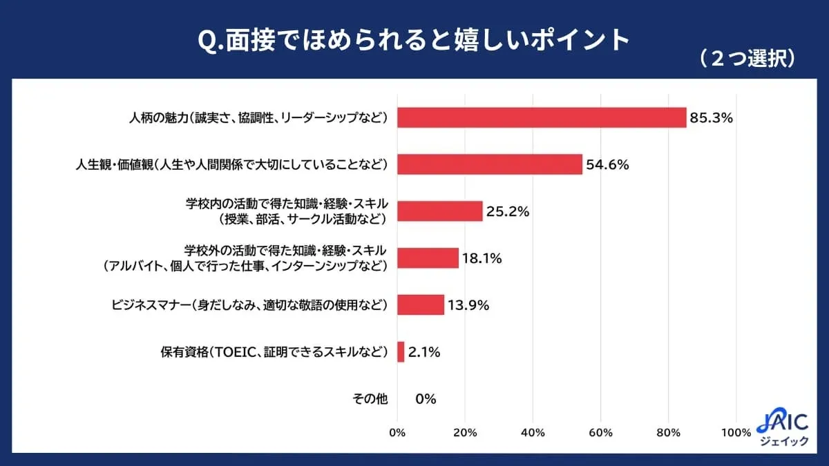 また、調査では学生たちの実際のエピソードも収集されました。「清潔感をほめられた」や「人間性を評価された」といった意見が多く、面接官から「一緒に働きたい」と言われたことが特に嬉しかったという声が印象的でした。