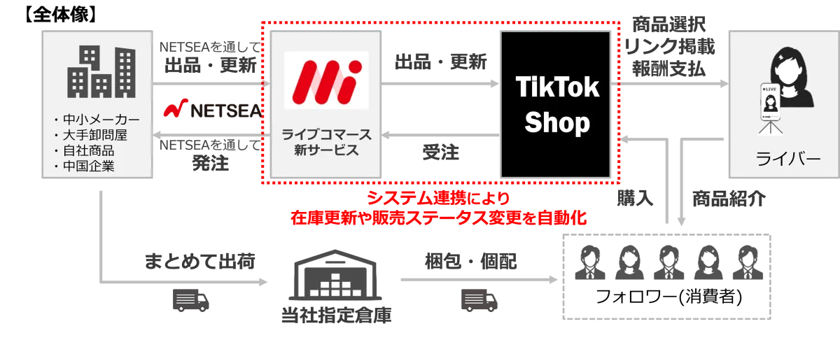 この新サービスは、ライブコマース市場に参入したいがリソースがない企業にとってもメリットがあります。NETSEAに出店することで、提携ライバーがTikTok Shop上でその商品を代行販売し、販路を新たに確保できるのです。これは、簡単な手続きでライブコマースによる販路拡大を実現できる画期的な方法と言えます。
