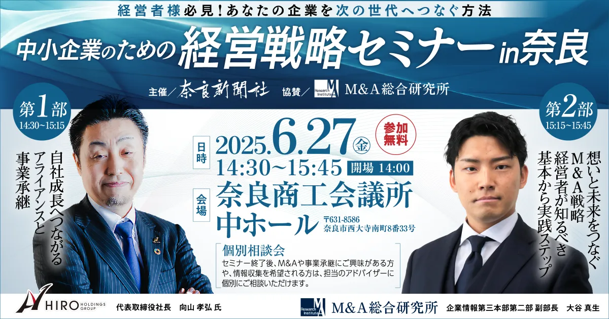 2025年6月27日、奈良県で中小企業向けの経営戦略セミナーが開催されます。このセミナーは、事業承継や成長戦略に関心のある経営者や企業の皆様を対象にしたもので、業界の専門家からの貴重な知見を得る機会です。