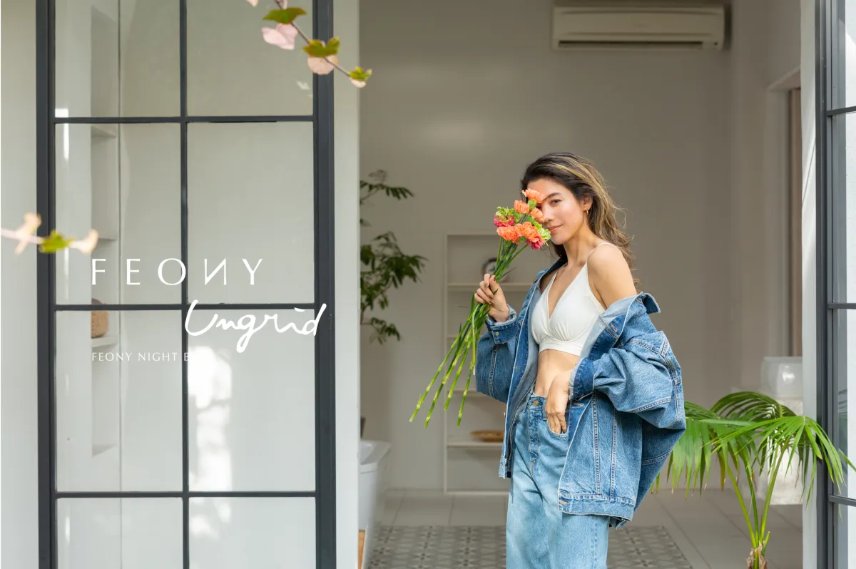 このナイトブラは、シンプルで洗練されたデザインが特長で、日常に溶け込むスタイルを提供します。商品名の「FEONY」は、女性の「Female」と花の「Peony」から名付けられ、女性の美しさを表現する意図が込められています。Ungridとの共同開発による洗練されたカジュアルなデザインは、お家時間を豊かに彩ります。