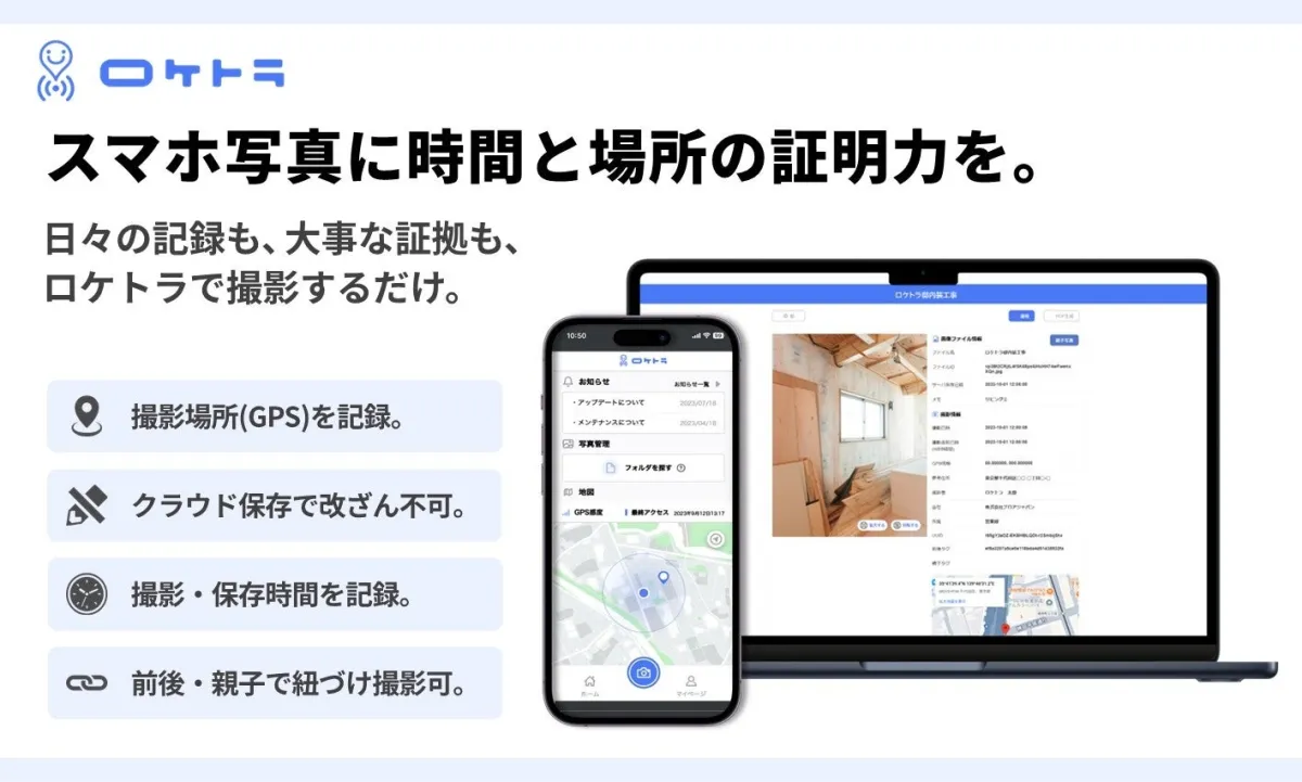 「ロケトラ」は、撮影した写真の真実性を証明するサービスです。撮影された写真は日時や位置情報とともにクラウド上のサーバに保存されるため、後からの編集や改ざんが一切不可能です。これからの新年度シーズンに向けて、業務での写真利用が増える中、信頼できる記録を残すことができるのです。