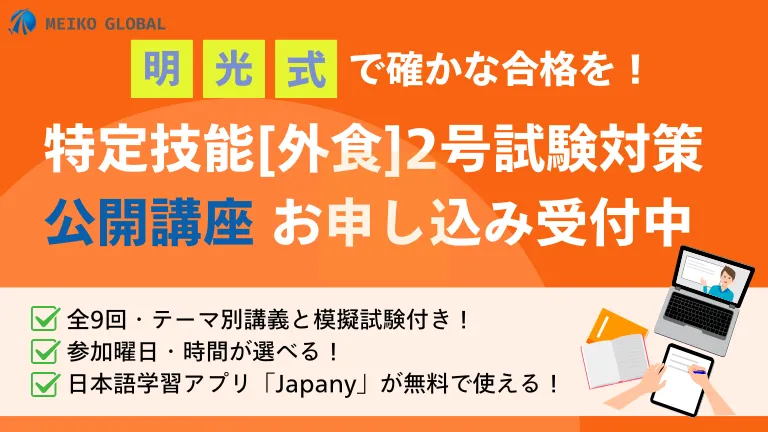 この講座は特定技能試験をクリアするための重要なステップです。外食業界でのキャリアアップを目指す方、および企業にとって、人材育成の一環として絶対に見逃せない内容となっています。