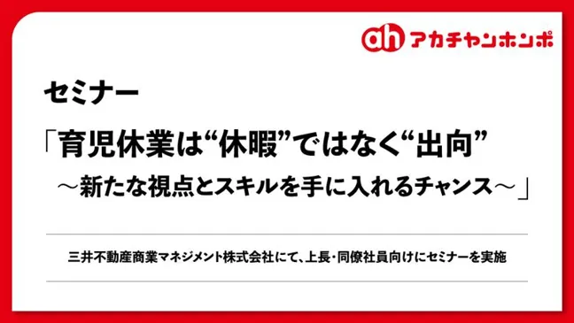 近年、育児休業に関する社会的関心が高まっています。この流れを受けて、株式会社赤ちゃん本舗は、三井不動産商業マネジメント株式会社の依頼により、男性の育児休業取得を促進するためのセミナー「育児休業は“休暇”ではなく“出向” ~新たな視点とスキルを手に入れるチャンス~」を開催しました。