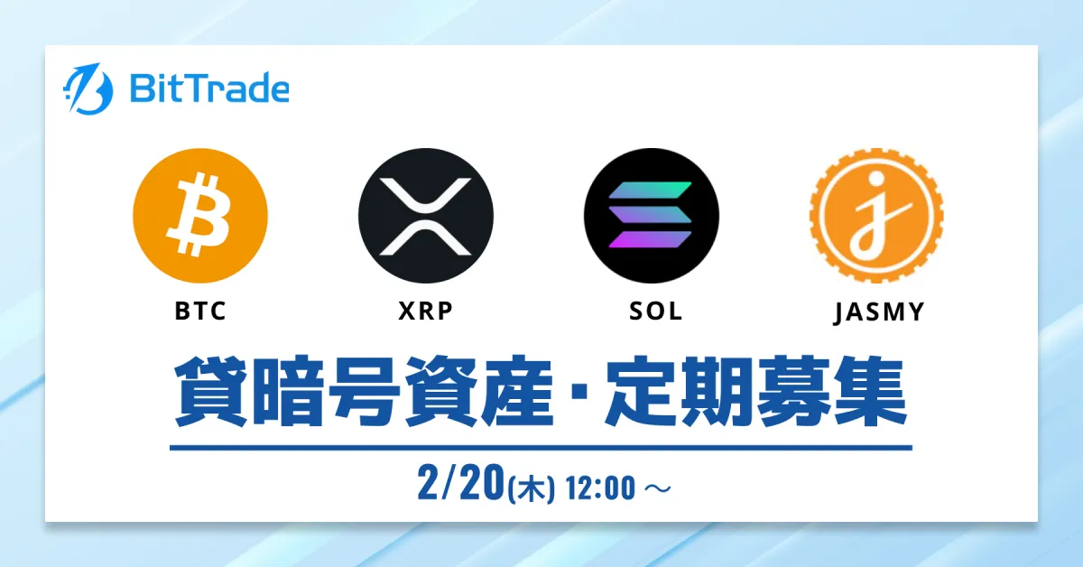 貸暗号資産の定期募集を開始します。この募集では、ビットコイン(BTC)、エックスアールピー(XRP)、ジャスミー(JASMY)、そしてソラナ(SOL)の4つの暗号資産が対象です。各資産における募集概要を詳しく見ていきましょう。