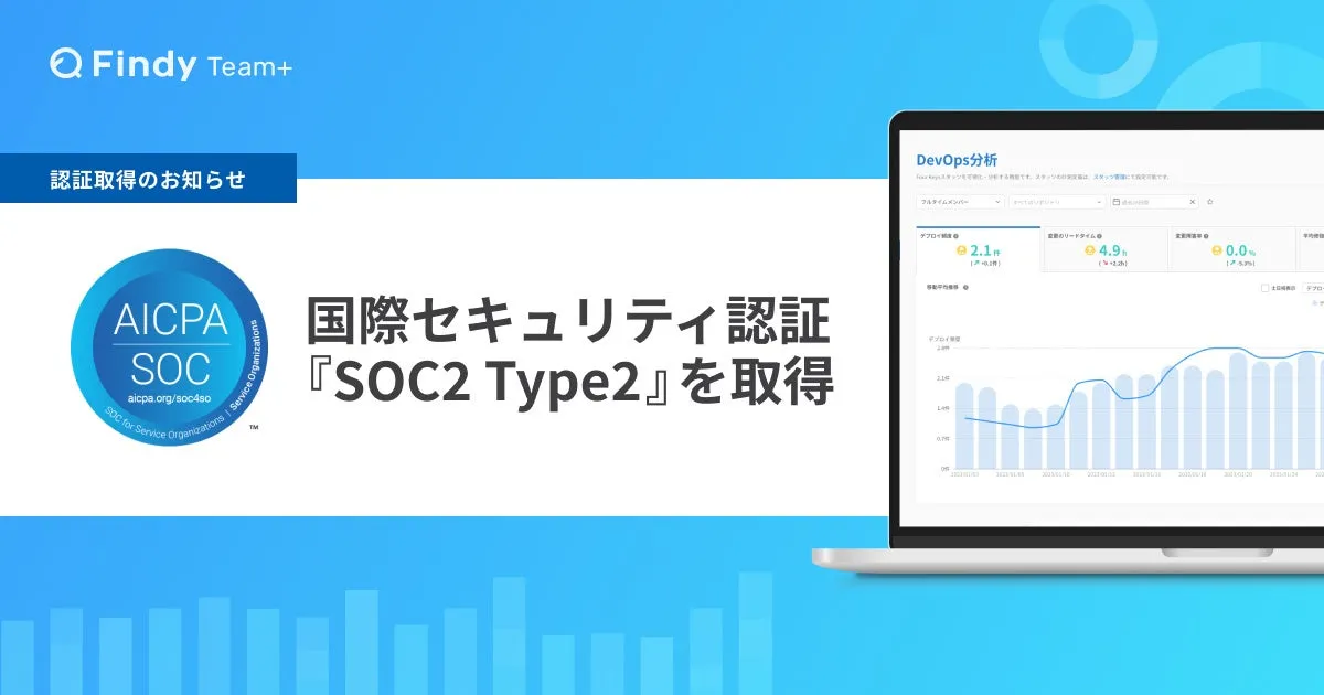 「Findy Team+」では、利用者が安心してサービスを利用できる環境作りに取り組んでいます。2022年にはISO/IEC 27001:2013を取得し、2025年1月には「SOC2 Type1」を取得、その後に「SOC2 Type2保障報告書」をも受領しました。