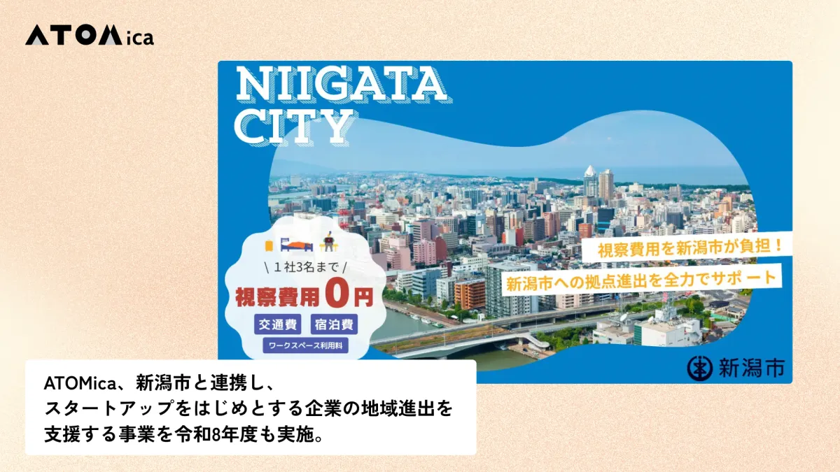 株式会社ATOMicaが新潟市との連携を強化し、令和8年度も企業支援事業を展開することが発表されました。このプログラムはスタートアップ企業に向けて新潟市との接点を増やし、地域進出の可能性を広げるものです。具体的には、視察に必要な交通費や宿泊費のほとんどを支援し、地元企業や教育機関とのマッチングを通じて、視察企業が具体的に新潟市内に拠点を設立する手助けを行います。