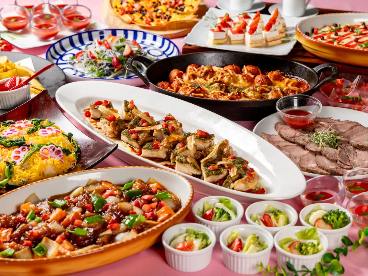「いちごブッフェ」は、いちごの多彩な魅力を引き出すメニューが特徴です。色鮮やかな料理や、豊かな個性を持つデザートがそろい、見ても食べても楽しめる内容が魅力です。