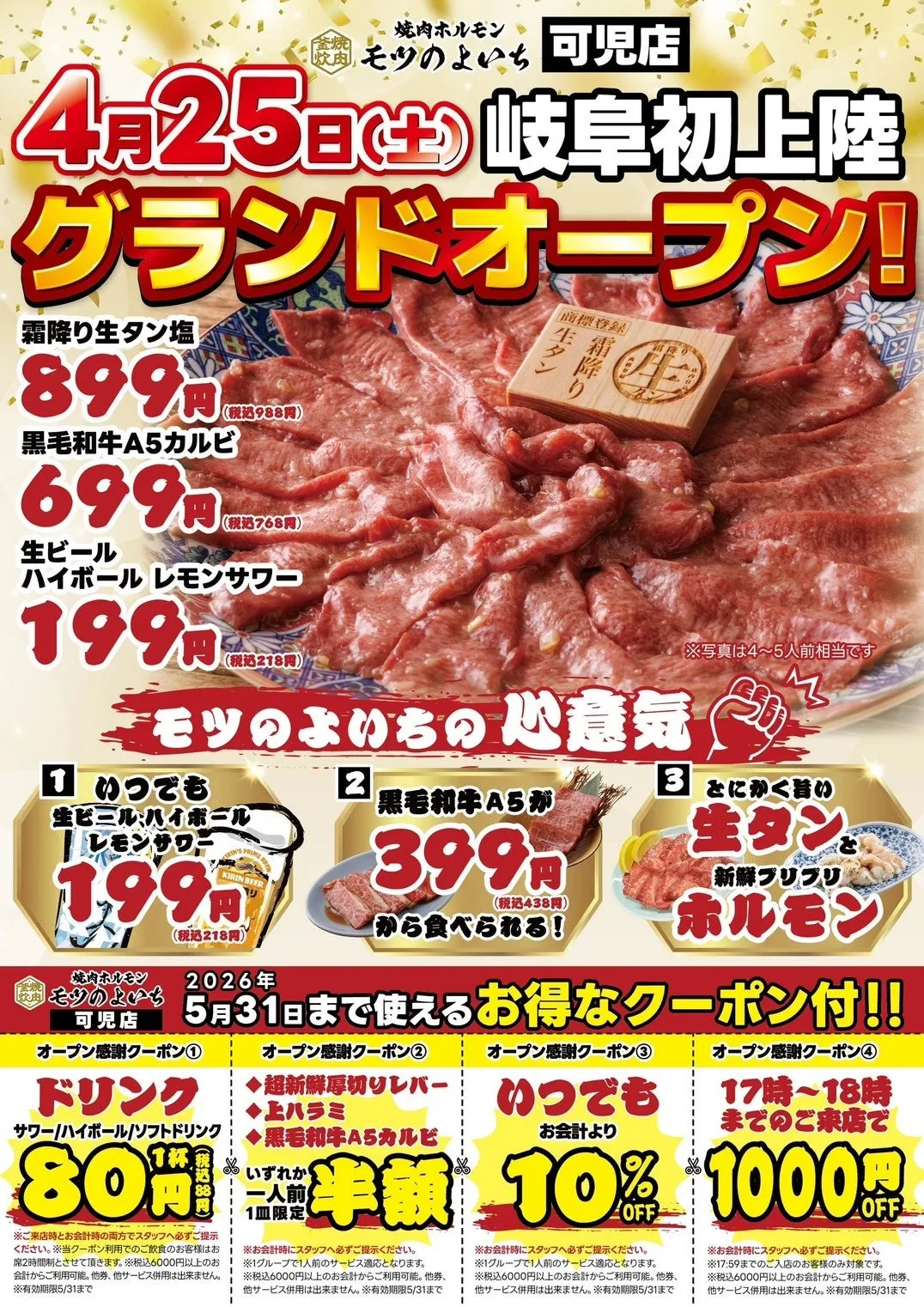 岐阜初上陸を記念して、可児店では特別なキャッシュバックキャンペーンを実施します。2026年5月末までに来店する全グループには、次回使えるお食事代金の半額分の金券を配布。なお、金券は6月から7月の間に利用でき、多くの方にお得に焼肉を楽しんでもらえるチャンスがあります。