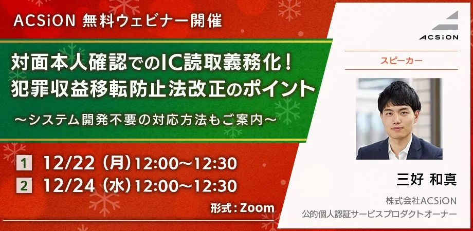 2023年12月22日と24日の二日間、企業向けに重要なウェビナーが開催されます。このウェビナーでは、2025年に施行される犯罪収益移転防止法の改正に伴い、対面での本人確認にIC読取が義務化される点について詳しく説明します。対面取引の本人確認は長らく、書類の提示や本人からの直接の確認が主流でしたが、今後、すべての証明にIC技術が求められることとなります。