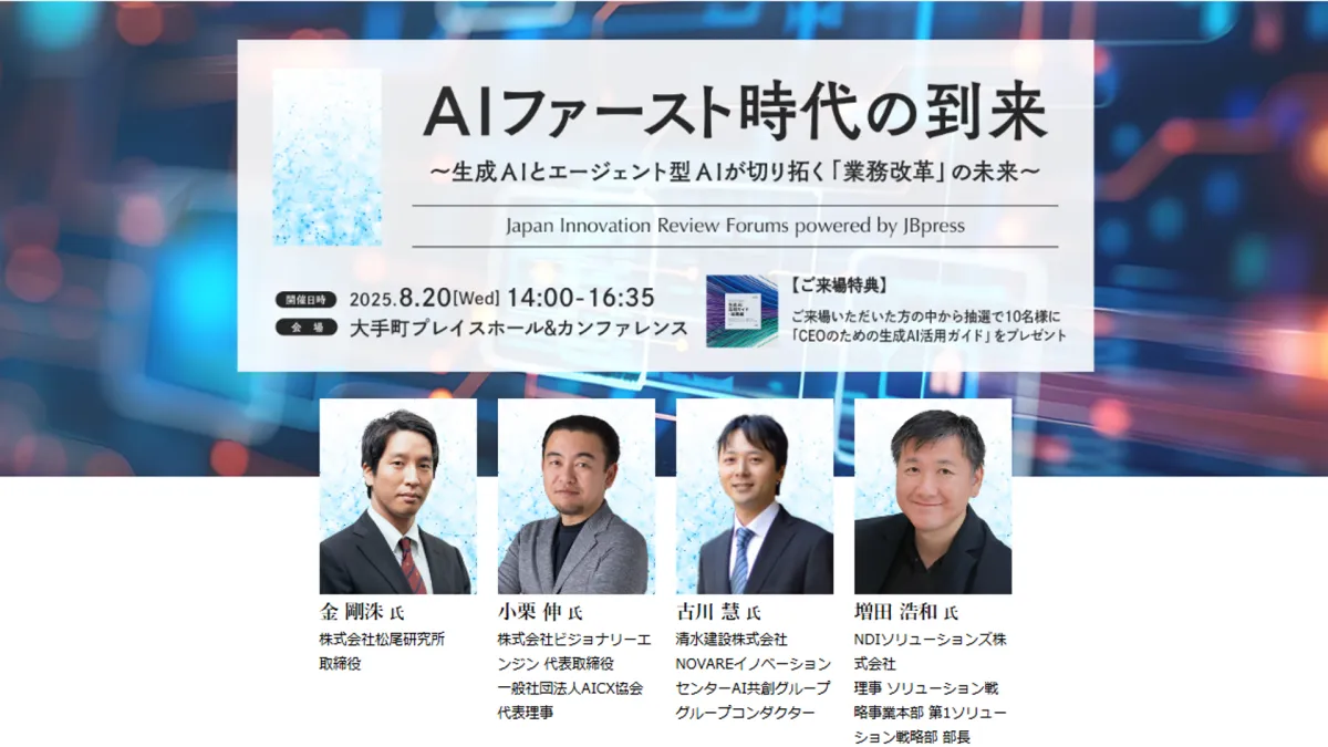 2025年8月20日(水)、AIファースト時代の到来をテーマにしたセミナーが、大手町プレイスホール&カンファレンスで開催されます。このイベントは、株式会社日本ビジネスプレスの主催によるもので、生成AIの導入が急速に進んでいる中、企業がどのようにAIを取り入れて変革を進めているのかを探ります。