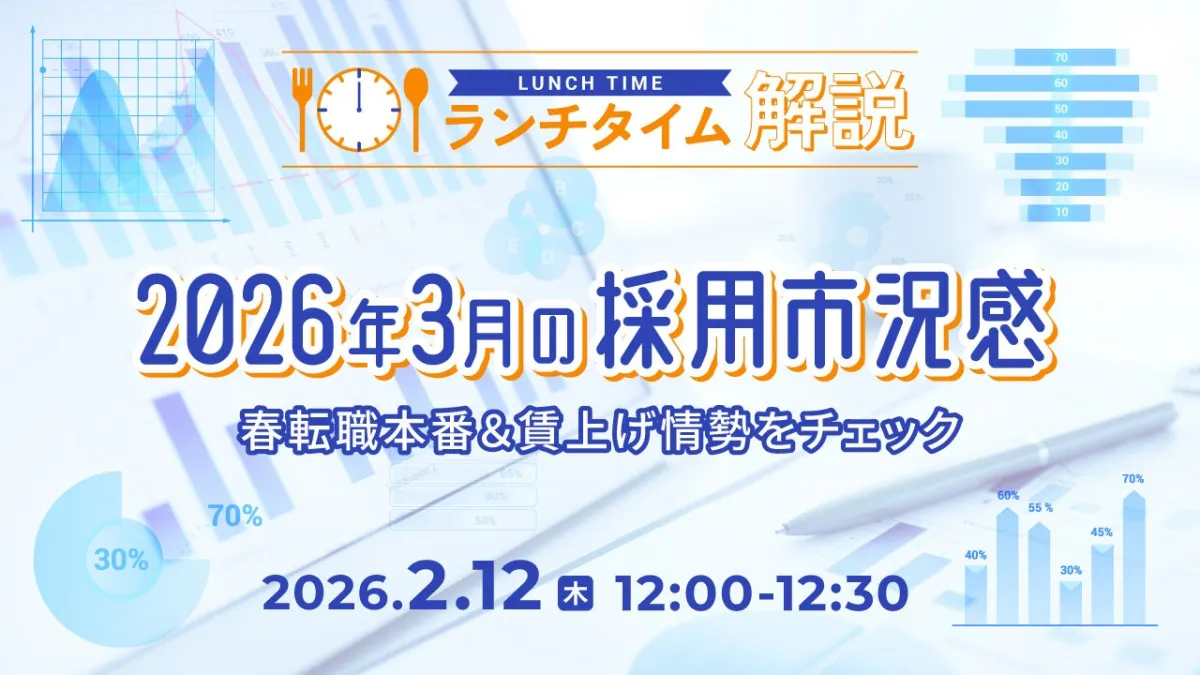 株式会社天職市場は、2026年2月12日(木)に「ランチタイム解説2026年3月の採用市況感春転職本番&賃上げ情勢をチェック」と題したオンラインセミナーを実施します。採用担当者にとって、日々の業務において変動する市場情報を効率的に収集し、業務に活かすことは極めて重要です。本セミナーは、忙しい採用担当者に最適な時間に、必要な知識を凝縮して学ぶ場を提供します。