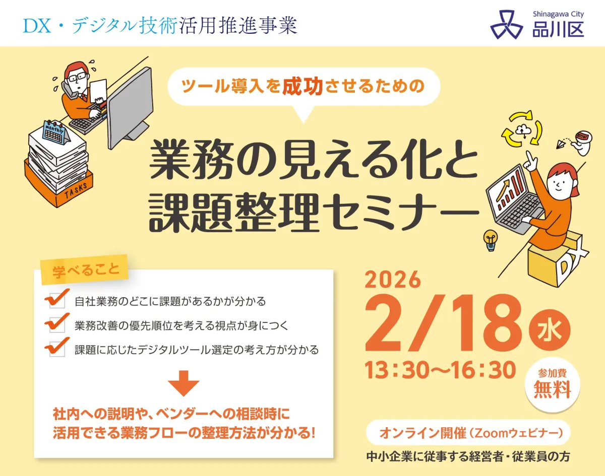 2026年2月18日(水)、品川区が主催するウェビナー「ツール導入を成功させるための業務の見える化と課題整理セミナー」がオンラインで開催されます。このセミナーは、中小企業の生産性向上やサービス品質改善を目指す方々に特におすすめです。
