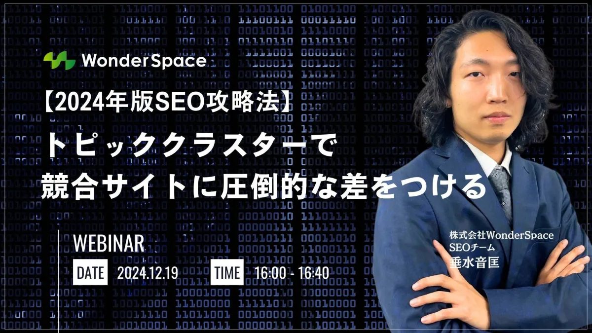株式会社WonderSpaceが、2024年を見据えた最新のSEOトレンドに関する無料ウェビナーを開催します。テーマは『【2024年版SEO攻略法】トピッククラスターで競合サイトに圧倒的な差をつける』です。このウェビナーは、メディアの成長を目指す経営者や編集長、担当者に向けた内容となっており、SEOの順位向上に苦労している方、効率的に成果を出したいと考えている方に最適です。