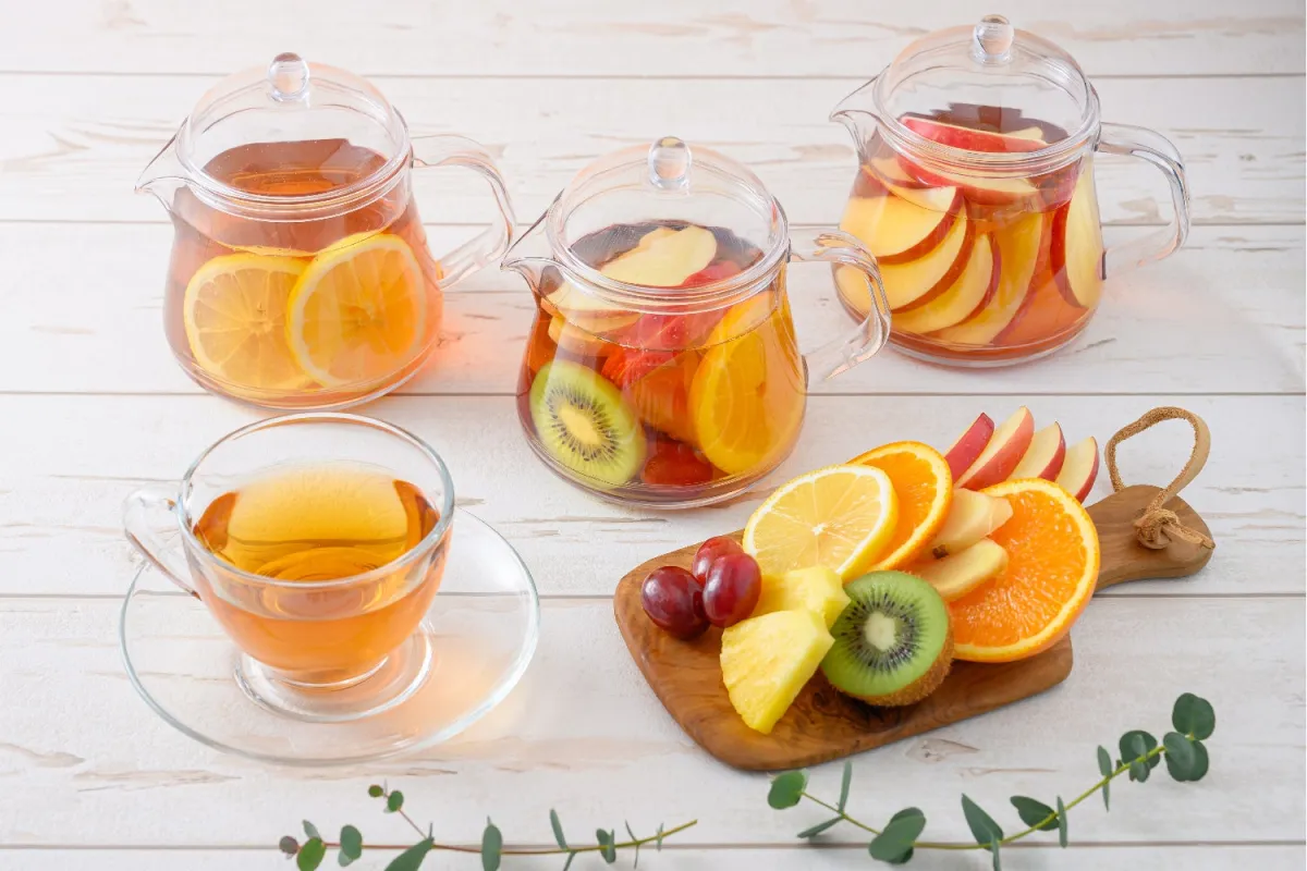 「果実のマリアージュティ」は、視覚的にも楽しませてくれる一杯です。色とりどりのフルーツが注がれ、目でも楽しむことができます。お皿に並べられたケーキや焼き菓子と合わせれば、特別なティータイムが演出されます。