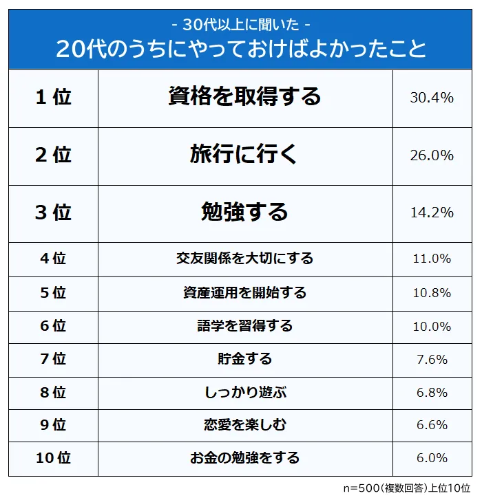 30代以上の500人に聞いた、20代にやっておくべきことの後悔TOP10