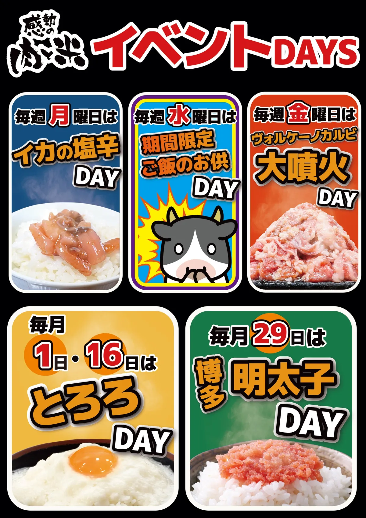毎月1日と16日は「とろろDAY」、29日は「明太子DAY」、月曜日には「イカの塩辛DAY」、水曜日には「期間限定ご飯のお供DAY」、金曜日には「ヴォルケーノ大噴火DAY」といった様々なイベントが開催されます。これらのイベントは、定期的に新しい味を楽しむいい機会です。