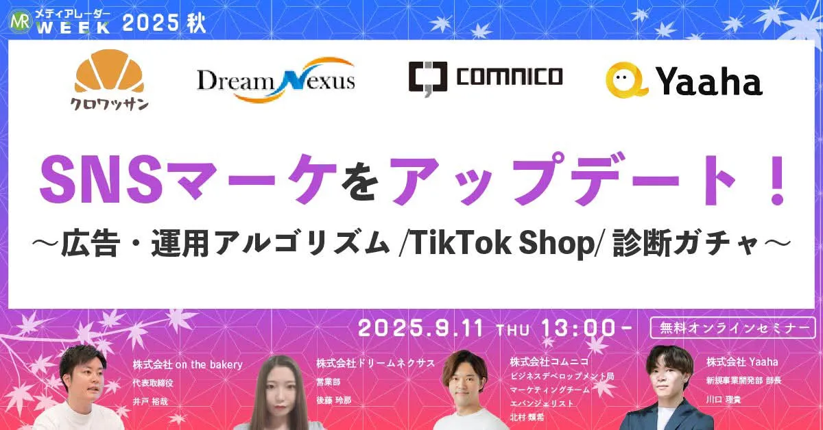 株式会社on the bakery(本社:神奈川県横浜市、代表取締役:井戸 裕哉)は、2025年9月11日に「メディアレーダーWEEK 2025秋」を開催します。今回のテーマは「SNSマーケをアップデート!〜広告・運用アルゴリズム / TikTok Shop / 診断ガチャ〜」で、特にSNSマーケティングにおける動向と最新手法が紹介されます。参加費は無料で、先着200名の参加者がオンラインで接続可能です。