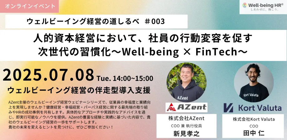 AZentの新見孝之氏は、自身のキャリアコンサルタント経験を活かし、個人のパーパスを意識したウェルビーイング経営の重要性を語ります。また、Kort Valutaの田中仁氏は、シリコンバレーでの経験を元に、金融包摂に力を入れている取り組みについての洞察を提供する予定です。