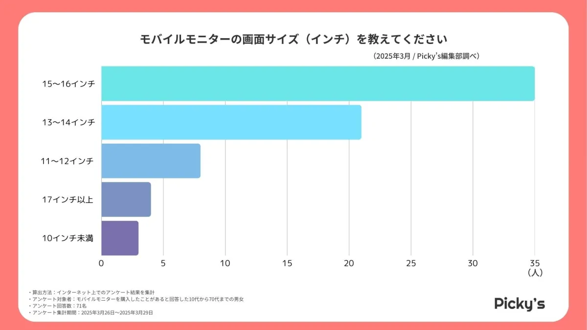 インターネット通販での購入時、実際に商品を手に取れない不安や、何を選べばいいかわからないといった悩みを抱える方は多いのではないでしょうか。そのような問題を解決するため、レビューや比較を通じて商品選びをサポートするPicky'sが、モバイルモニターに関するアンケートを実施しました。今回はその調査結果を詳しくご紹介し、利用者たちのリアルな声をお届けします。