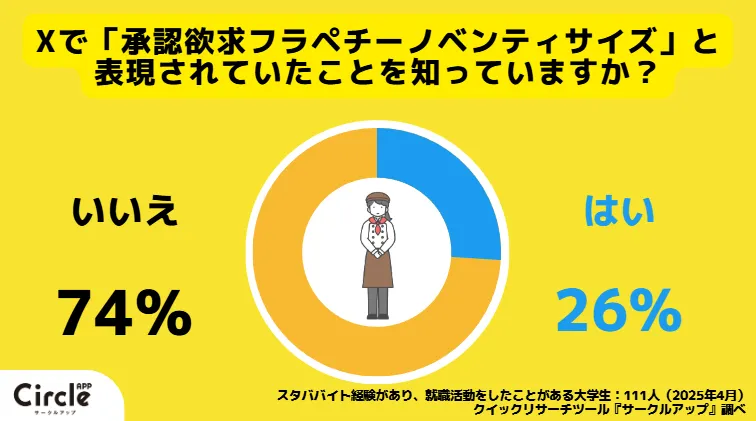 調査対象は、スターバックスでアルバイトをしている、または過去にその経験がある大学生です。興味深いことに、約42%の学生が「承認欲求フラペチーノベンティサイズ」という表現に共感できると回答しました。この表現は、スターバックスのバイト文化における承認欲求を温かく皮肉的に称賛するものとして流行しています。