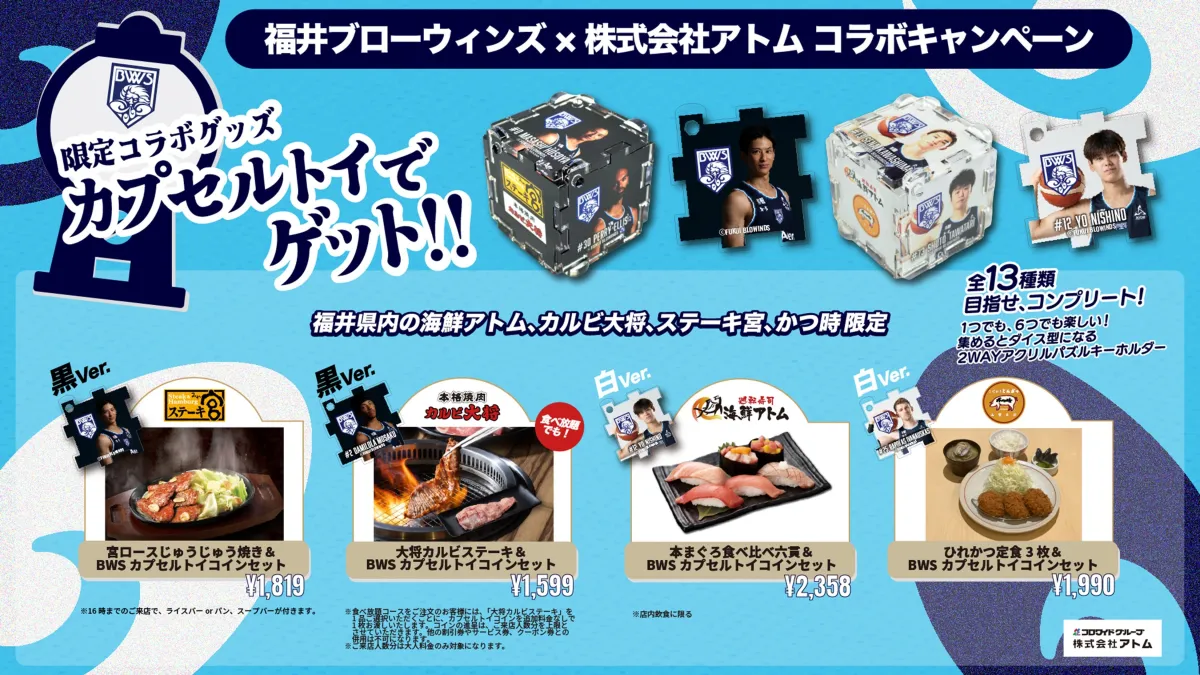 福井県内で大人気の株式会社アトムが、地元プロバスケットボールチームである福井ブローウィンズとのコラボレーション企画を再実施します。この嬉しいニュースは、食事を楽しみながら特製のカプセルトイも手に入れられる絶好の機会です。実施はアトム運営の全20店舗にて行われ、地域連携の新たな試みとして注目を集めています。