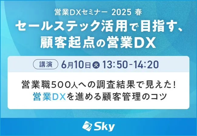 Sky株式会社は、2025年6月10日(火)に開催される「営業DXセミナー 2025 春」に協賛します。このセミナーは、ITmedia ビジネスオンラインが主催するライブ配信形式のイベントで、ビジネスの未来を見据えた営業活動の進化を探ります。