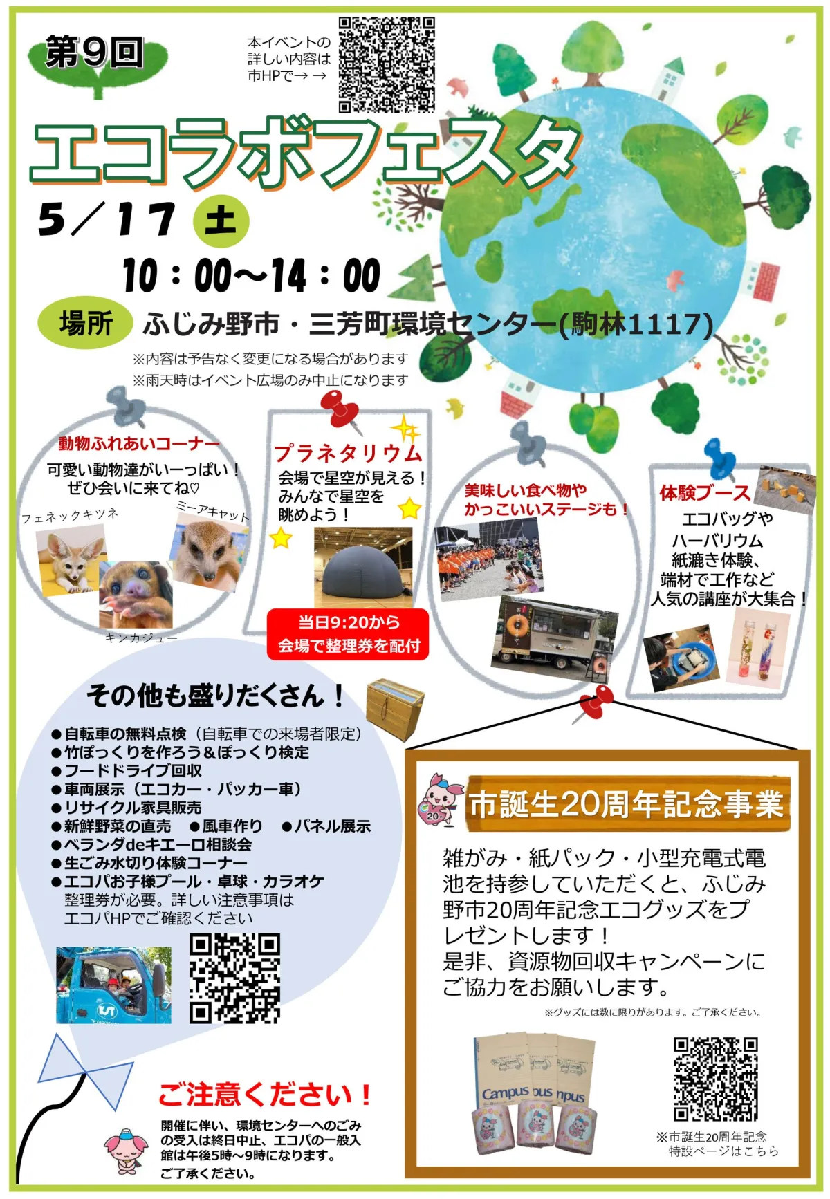 令和7年5月17日(土曜日)、ふじみ野市の三芳町環境センターで「第9回エコラボフェスタ」が開催されます。このイベントは、エコをテーマにしたさまざまな催しを通じて、環境問題について学び、楽しむことができる貴重な機会です。子どもから大人まで、幅広い世代が参加できる内容となっています。