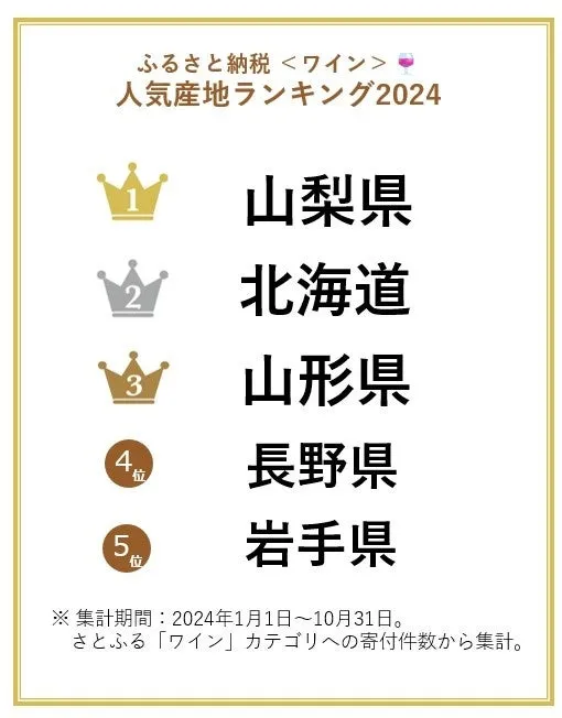 人気産地ランキングでは、山梨県が堂々の1位。日本ワインのメッカとも言えるこの地域からは、さまざまな種類のワインが生まれています。次いで、北海道と山形県が続き、これらの地域のワイン愛好家にも支えられています。ふるさと納税の寄付先でこれらの産地を選ぶことで、ほかでは味わえない特選ワインに出会えるチャンスが広がっています。