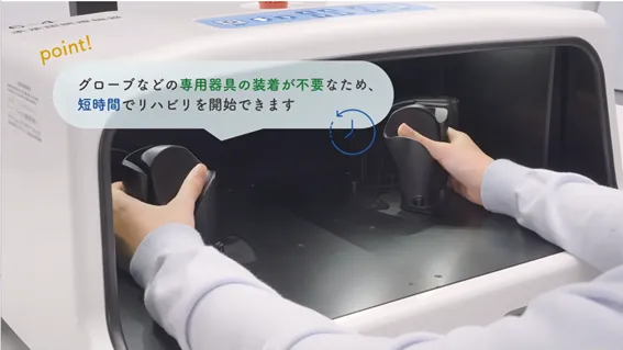 専用機器の装着は不要で、ロボットハンドに手を入れるだけで使用可能。これにより、患者はすぐにリハビリを始めることができます。