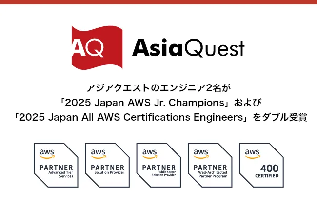 デジタルトランスフォーメーションの最前線で活動しているアジアクエスト株式会社のエンジニア、矢内碧人氏と足立和生氏が、名誉ある「2025 Japan AWS Jr. Champions」と「2025 Japan All AWS Certifications Engineers」のダブル受賞に輝きました。これにより、彼らの努力と専門性が広く認められることとなりました。