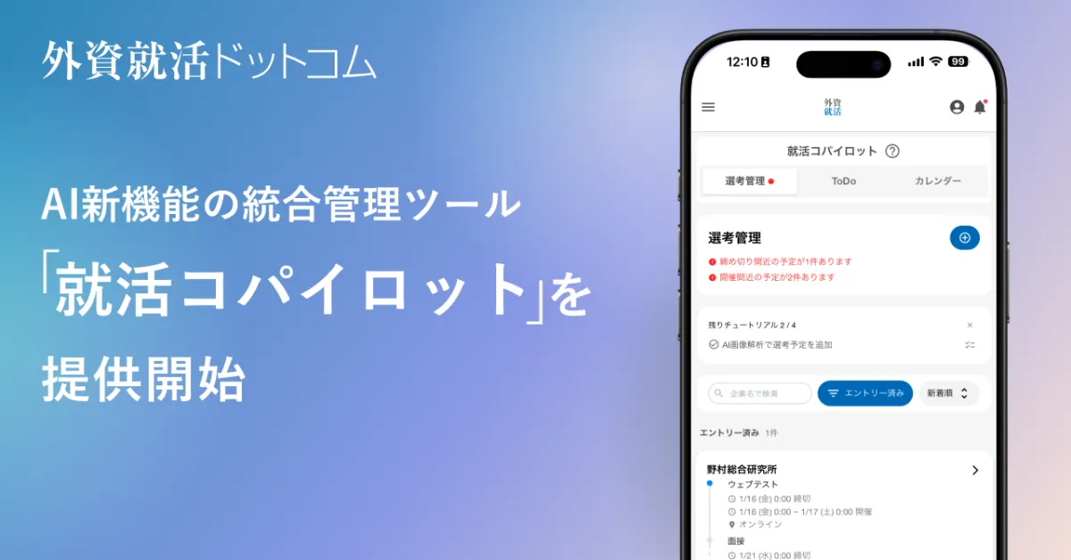 株式会社ハウテレビジョンが運営する「外資就活ドットコム」が、就職活動を支援する新機能「就活コパイロット」をローンチしました。この新サービスは、就職活動に取り組む学生たちが直面している様々な課題を解決するために設計され、AI技術を駆使して進捗管理やスケジュールの一括管理を実現します。