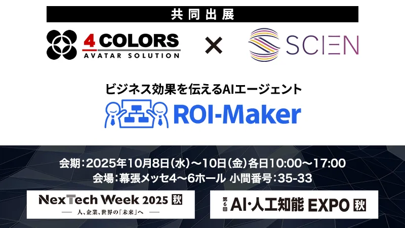 2025年10月8日から10日の期間、株式会社4COLORSは、東京大学 松尾研究室初のスタートアップであるSCIENと共同で、幕張メッセにて開催される「AI・人工知能EXPO」に出展することを発表しました。この展示会では、最新のAI技術と「ROI-Maker」を組み合わせて、次世代のAI活用事例を紹介します。ブース内を通じて、製品の詳細やその効果を具体的に示すセミナーも予定されており、参加者の皆様をお待ちしております。