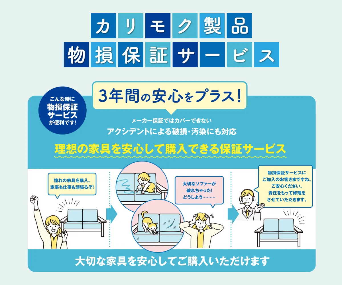 多くの家庭で、特に小さなお子さんがいる場合やペットを飼っている場合には、家具が物損するリスクは常につきまといます。カリモク家具のこの新しいサービスは、そうした不安を軽減し、安心して製品を利用してもらうことを目的としています。