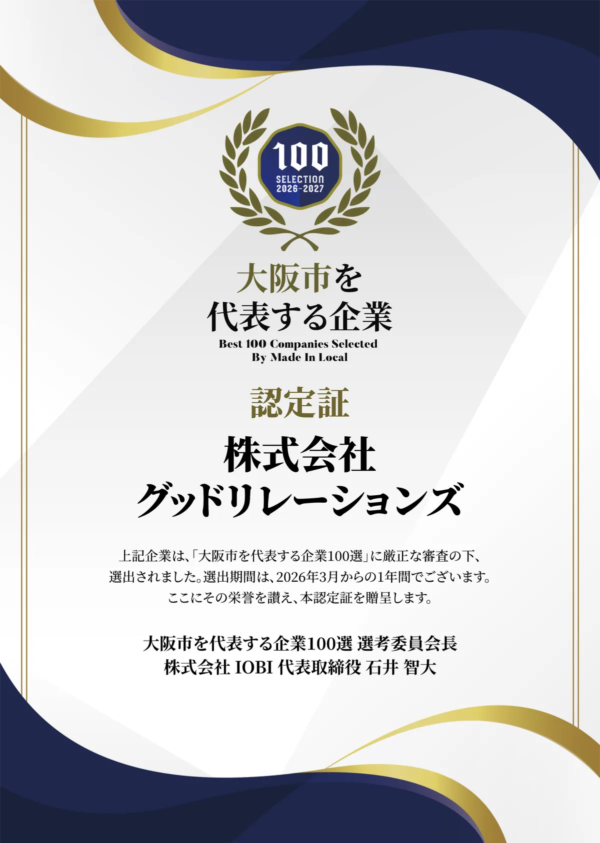 株式会社グッドリレーションズは、このたび「大阪市を代表する企業100選」に選ばれ、大きな注目を浴びています。本企画は、大阪市に本社または主要拠点を置く企業の中から、厳しい基準に基づいて選ばれるもので、多くの企業の中から選ばれることは名誉なことです。