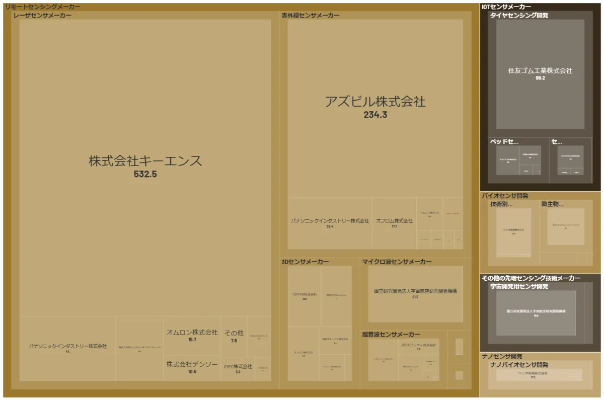 カオスマップは、23の技術および製品別に体系化されており、各企業の市場ポジションが視覚的に示されています。この情報は、業界内部の動向を把握したい企業や関係者にとって、非常に有益です。さらに、公開されたカオスマップでは、国内の先端センシング技術の市場規模が約1,574.9億円から2030年には2,216.5億円に成長すると予測されています。