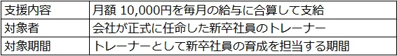 新入社員にとって、企業文化や業務の流れを理解し、スムーズに業務に入るためには、トレーナーからの支援が欠かせません。そこで、トレーナーに手当を支給することでその役割を評価し、育成の質を高める狙いがあります。この制度の導入により、新入社員の早期戦力化が促進されることを期待しています。
