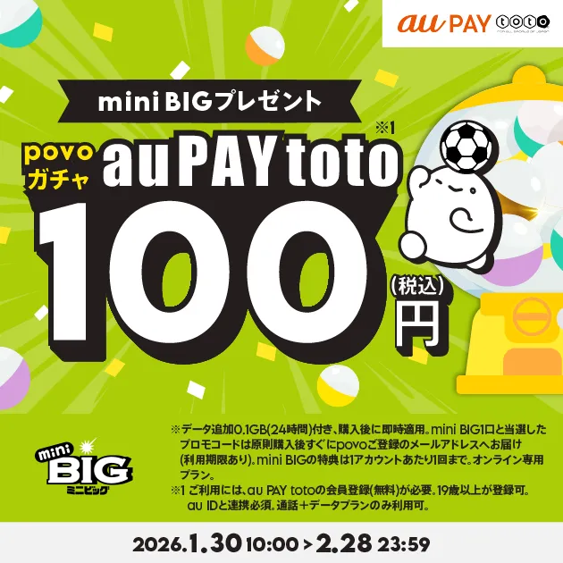 KDDIと沖縄セルラーが、2026年1月30日から2月28日までの期間に、povo2.0に新たな魅力を加えるコラボレーションを発表しました。これは、au PAY totoの「mini BIG」を抽選で当たるという新しい企画「povoガチャ au PAY toto ~mini BIGプレゼント~」です。スポーツくじのファンや、データ通信を活用したい方にとって見逃せないチャンスとなります。