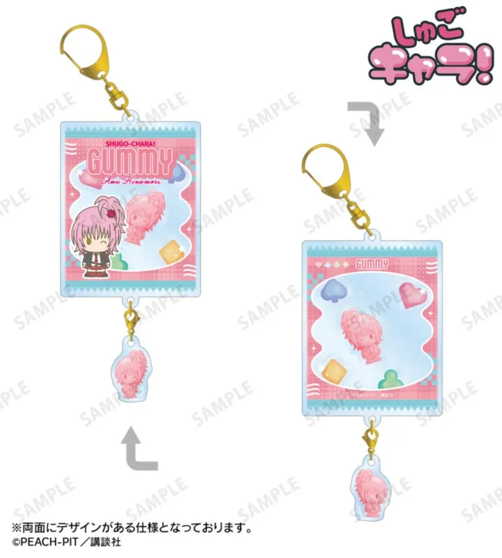 このキーホルダーは、お菓子のテイストで描かれた日奈森 あむと月詠 イクトのイラストを使用しています。振ると中の小さなパーツが動くので、遊び心も満載!サイズは約85×60mmで、価格は1,980円(税込)です。