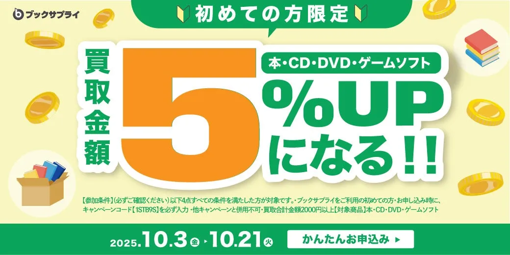 ブックサプライは、2025年10月3日から10月21日まで、初めて宅配買取サービスを利用する方を対象にした「買取金額5%UPキャンペーン」を実施します。最近では、本やCD、DVD、ゲームソフトなどのリユース需要が高まっていますが、まだ利用したことがない方も多いはず。そんな新規のお客様が手軽に体験できるこのキャンペーンは、リユースを通じて循環型社会の実現に向けた重要な一歩です。