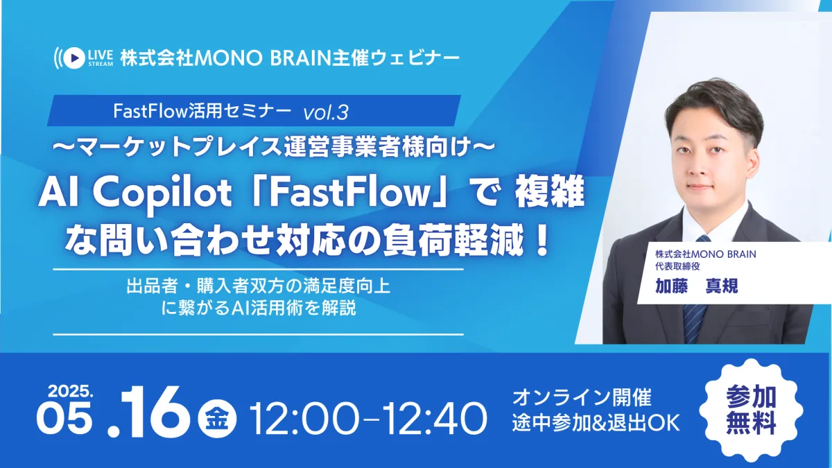 2025年5月16日に、株式会社MONO BRAINが主催する無料オンラインウェビナーが開催されます。このイベントでは、マーケットプレイス運営事業者向けに、カスタマーサポート業務特化型AI「FastFlow」の活用法が紹介される予定です。