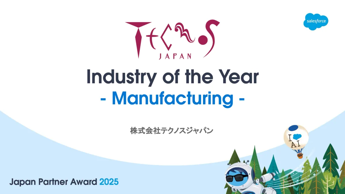 株式会社テクノスジャパン(本社:東京都新宿区、代表取締役社長執行役員:吉岡隆)は、Salesforce Japan Partner Award 2025において「Industry of the Year –Manufacturing–」を受賞しました。この受賞は、2024年度のManufacturing領域における卓越した協業の成績が評価されたものです。