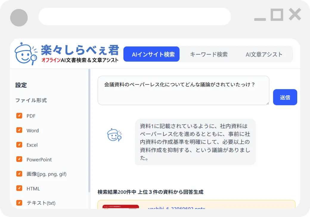 RAGは通常、データの整形や投入のために多大な工数を要するため、その利用価値が限られがちです。しかし、楽々しらべぇ君はPCにインストールする形式のため、検索エンジンとしての利用価値も高いのです。ユーザーがキーワードや質問文を入力すると、PC内の関連資料を迅速に検索し、提示します。