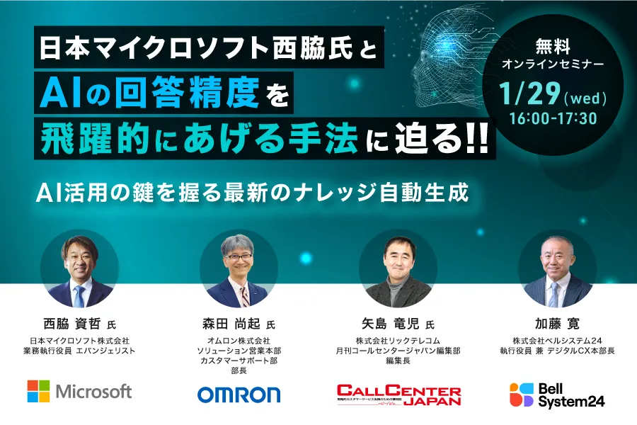 2025年1月29日(水)、株式会社ベルシステム24が主催するオンラインセミナー「AIの回答精度を飛躍的に向上させる手法」が開催されます。このセミナーでは、日本マイクロソフトの業務執行役員でエバンジェリストである西脇資哲氏が講演を行い、生成AI技術の最新トレンドとコンタクトセンターの未来をテーマにしています。