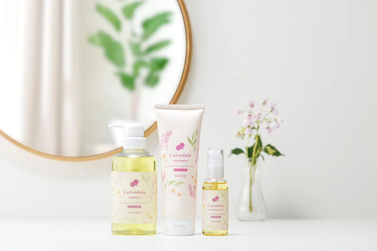 このヘアケアシリーズの共通成分として使用されているのが、カレンデュラオイルです。北海道白老町で有機栽培されたカレンデュラの花びらから丁寧に抽出されたオイルは、乾燥から髪と頭皮を守り、自然な艶感と滑らかな指通りを実現します。また、以下の3つのアプローチで髪の健康をサポートします: