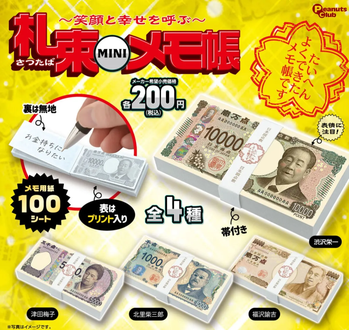 株式会社ピーナッツ・クラブ(本社・大阪府東大阪市)から、新紙幣のデザインをモチーフにしたカプセルトイ『札束ミニメモ帳』が、2024年7月23日より順次、全国のカプセルトイ売場で発売されます。