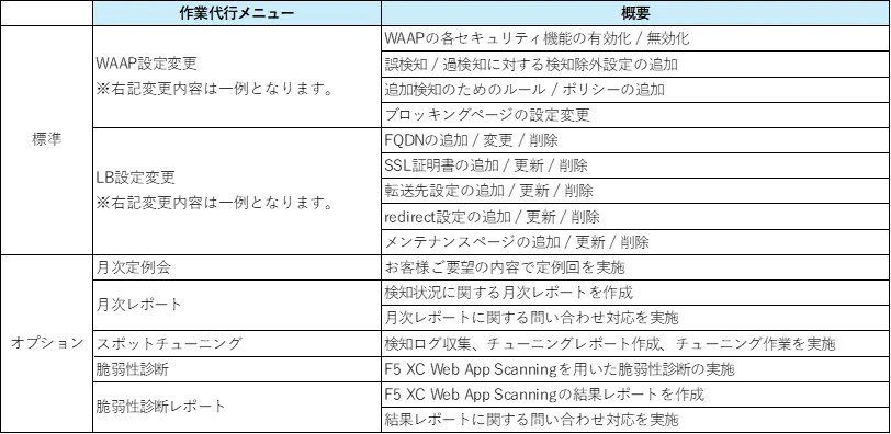 具体的な作業代行メニューは、多岐にわたりますが、主にF5 XC WAAPの設定や運用に関する各種作業を行います。また、事前に顧客のリクエストを聞くことで、一人ひとりに合わせた最適なサービスを提供します。