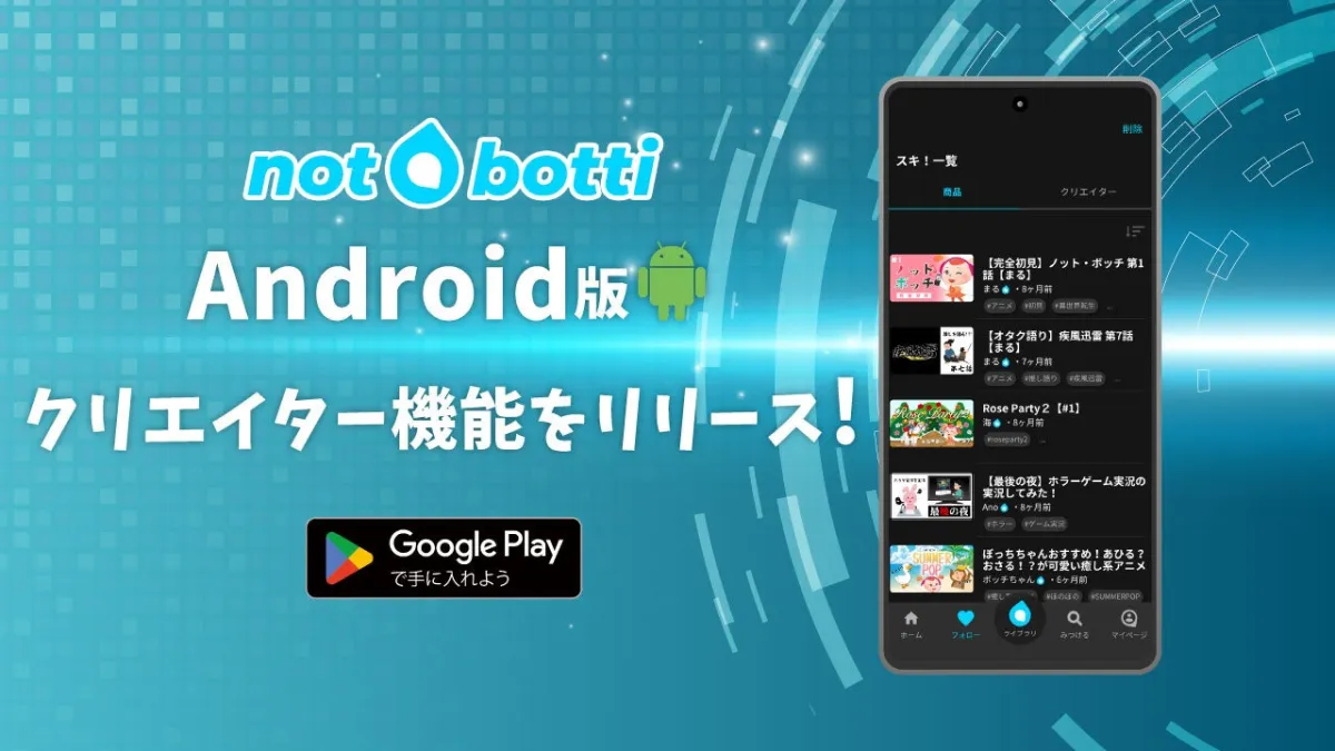 株式会社O&P Mediaが提供する副音声アプリ『ノットボッチ(not botti)』が、Android版に「クリエイター機能」を実装しました。この機能の追加により、Androidユーザーも手軽に自分の副音声コンテンツを制作・公開できるようになります。