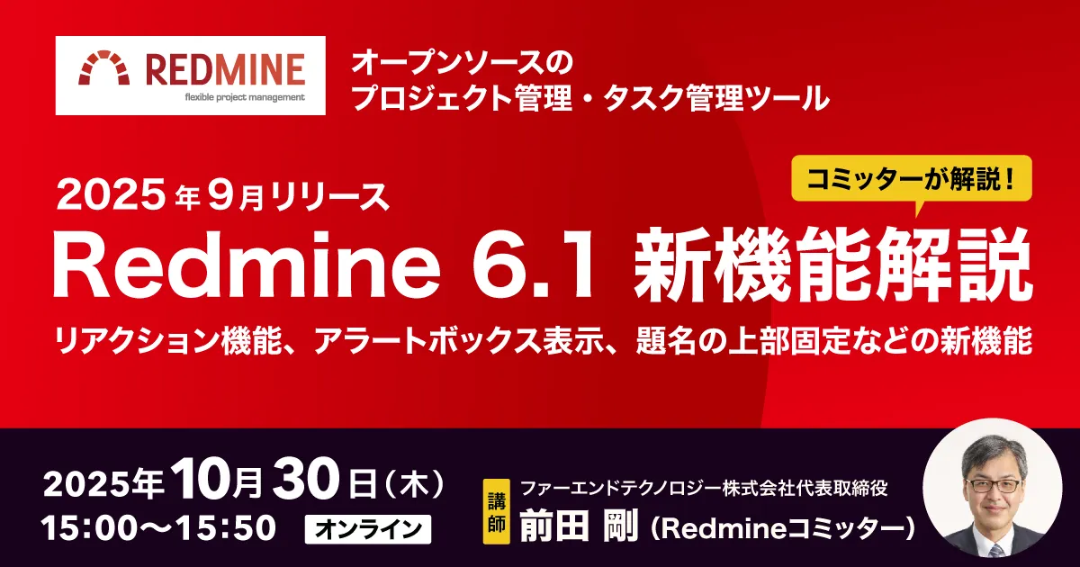 2025年10月30日(木)、ファーエンドテクノロジー株式会社がオープンソースプロジェクト管理ツール「Redmine 6.1」の最新機能を紹介するオンラインセミナーを実施します。